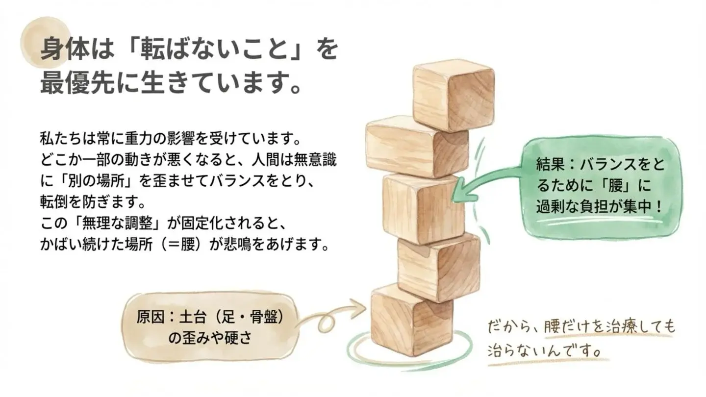 →「ぎっくり腰=腰の問題」ではなく、「腰が限界を迎えた最終結果」。本当の原因は、全身のどこかにある。