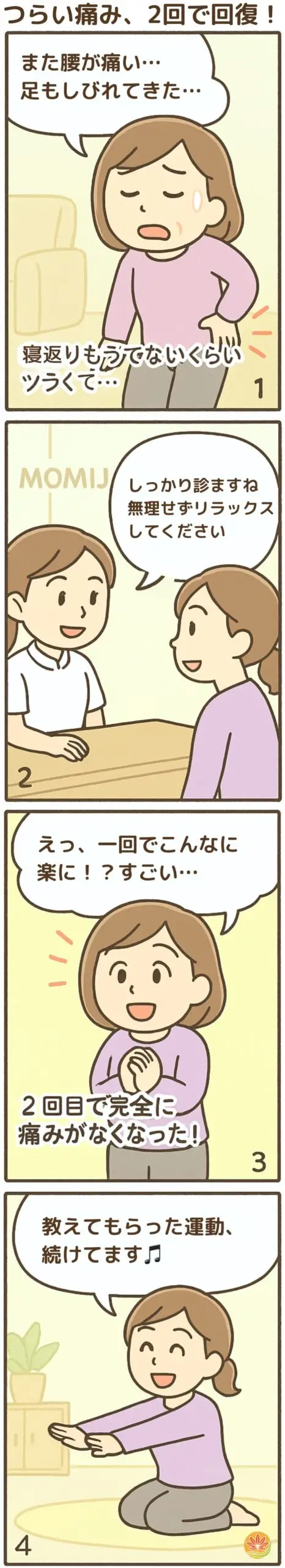 今回は、腰の痛みから足がしびれて、重だるくなり、寝返りも辛い状況で、MOMIJIさんに行きました。1回の施術で随分楽になり、2回目で完全に治りました。また悪くならないように、自分で家でもできる運動を教えてもらったので、それをやって今も痛みは出てません。また痛くなったら行こうと思います。