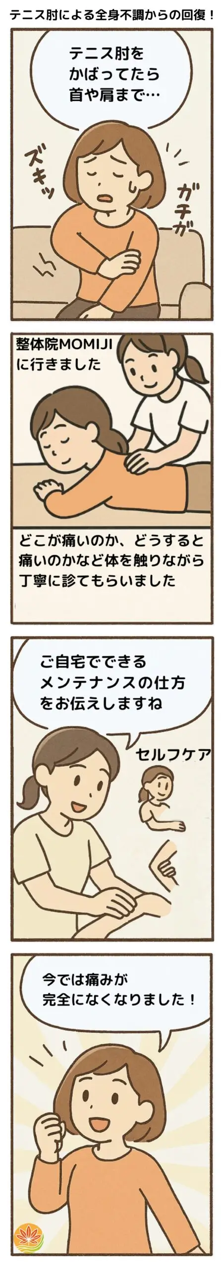 テニス肘をかばって生活するせいで、頸や肩まで痛くなり診てもらいました。どこが痛いのか、どうすると痛いのかなど体を触りながら丁寧に診てもらいました。すぐによくなるというわけではないけど、マッサージの仕方やメンテナンスの大切さなどいろいろ教えてもらいました。2ヶ月がたって今はよくなりました!!
