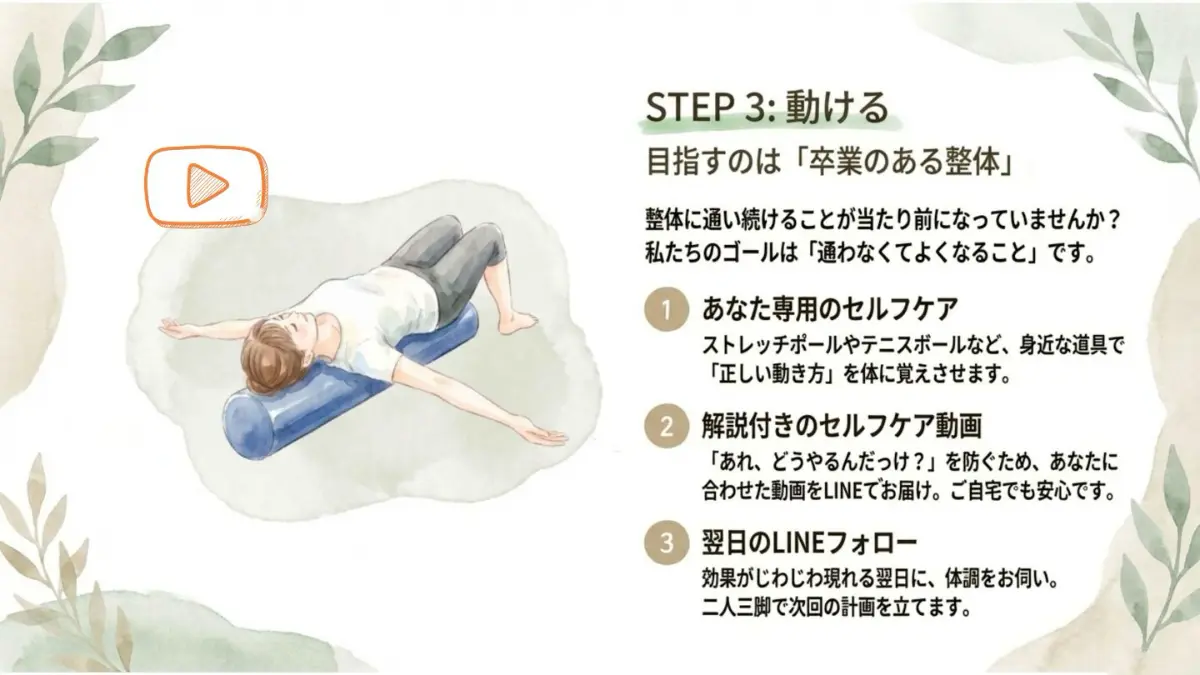 3. 動ける: あなた専用のセルフケアを身につけ、自分の力で体を良い状態に保てる(動ける)ようにします。